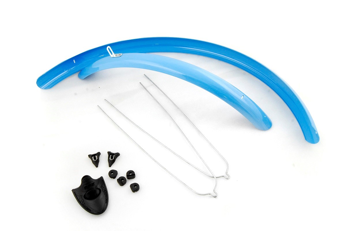 Komplet błotników do rowerów o rozmiarze koła 26''. Kolor niebieski. Szerokość 51 mm. Błotniki wykonane z trwałego, lekkiego tworzywa. Odporne na warunki atmosferyczne. W zestawie błotniki+druty.